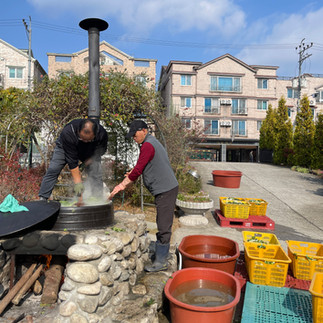 교회 사역에 쓰일 맛김치를 만들기 위해 배추를 먹기 좋은 크기로 잘라 절임했고, 일부는 시래기를 만들기 위해 가마솥에 삶아 햇빛 좋은 곳에 말렸습니다.
