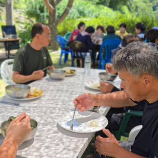 말씀강해 후에는 점심식사가 이어졌습니다. 메뉴는 추어탕, 가마솥밥, 소금백김치, 과일. 더위를 뚫은 목사님과 집사님들의 크신 사랑에 더욱더 풍성하고 보양이 되었던 귀한 식사였습니다.