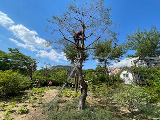 해마다 키가 1m이상 자라는 소나무의 특성으로 정원이 우거져 각종 병충해와 정원의 음지화를 우려해 소나무 전지에 나섰습니다. 교회 건축 당시부터 목사님과 성도들의 돌봄으로 자라온 나무들인 만큼 아름다운 수형을 자랑하는데요, 나무에 올라타 세심한 작업이 이루어지는 쉽지 않은 일이었습니다. 아이들도 함께 정원을 가꾸는 자세와 정신을 배우며 은혜 가운데 안전사고 없이 성황리에 마쳤습니다. 기도로 도와주신 분들, 모두에게 감사합니다!